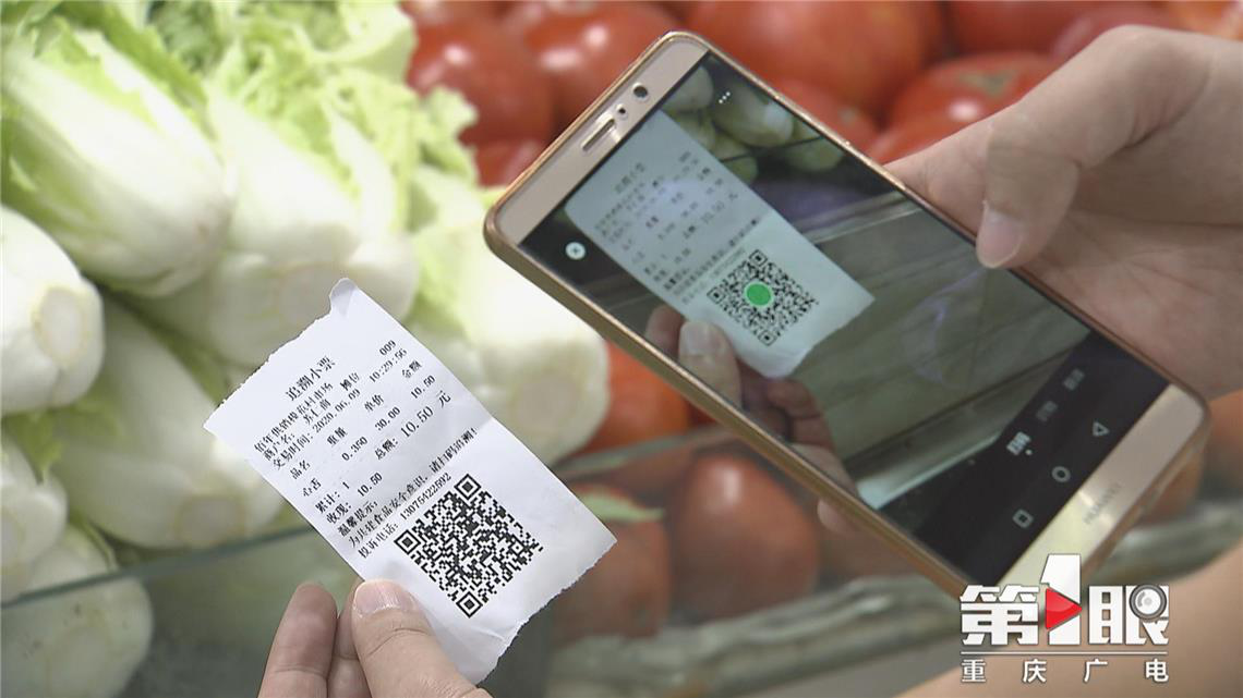 第1眼記者注意到,在農(nóng)貿(mào)市場的每一筆交易,消費者都可獲得具有追溯代碼的小票,掃描二維碼,就能獲取所購農(nóng)產(chǎn)品的供應商及其資質(zhì)證明等信息。